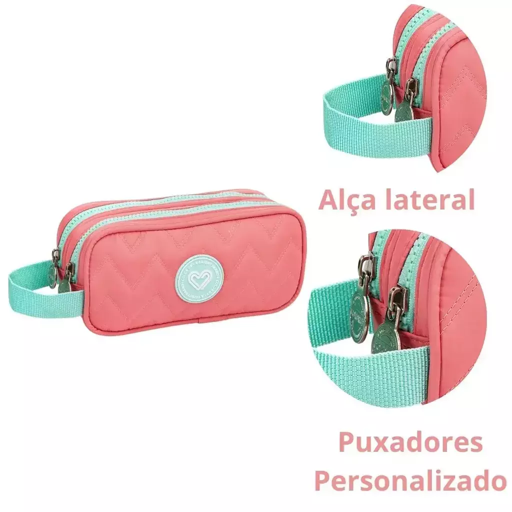 Características: ESTOJO DUPLO FEMININO 100% POLIÉSTER | DOIS COMPARTIMENTOS | PUXADORES PERSONALIZADOS | MATERIAL COM EFEITO MATELASSÊ | ALÇA LATERAL | MEDIDAS: 21 CM (L) X 10 CM (A) X 6 CM (P)